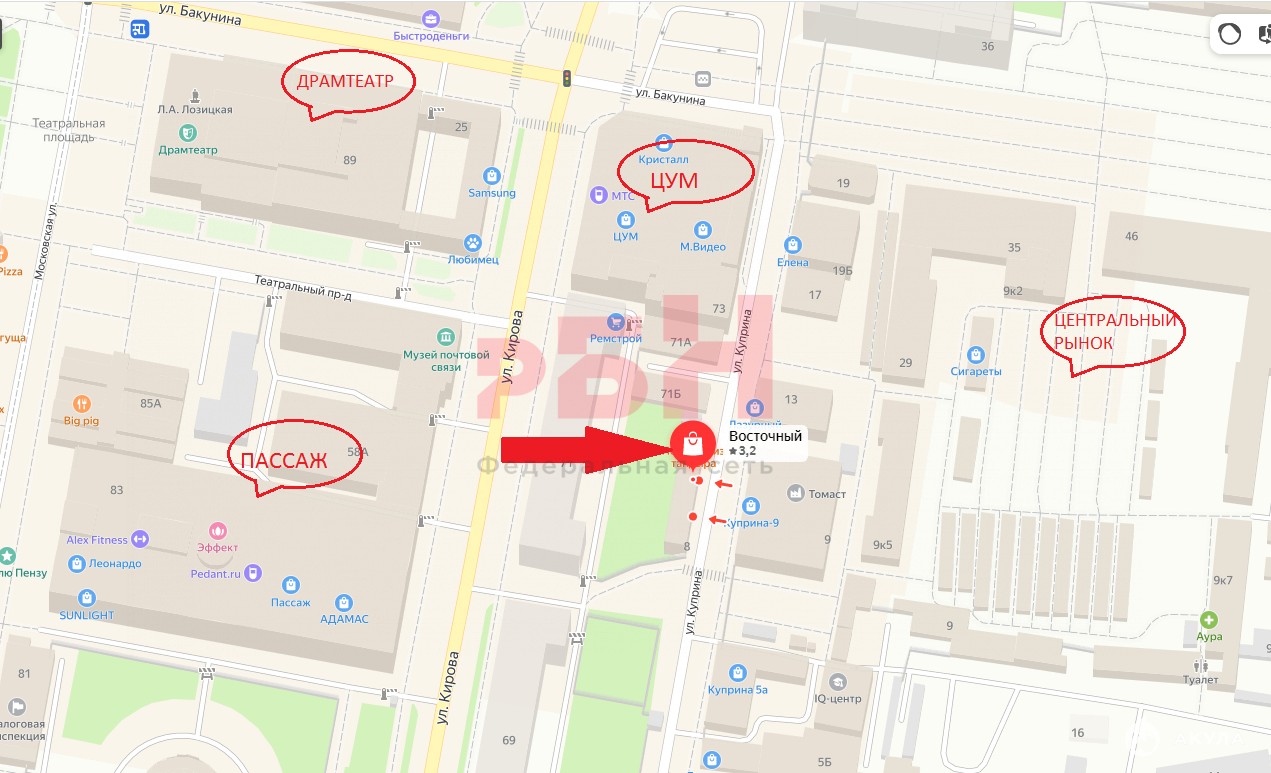 Сдается в аренду офис 51, 6 кв.м. в районе Центрального рынка на третьем этаже в действующем ТЦ "Восточный базар" по адресу: г. Пенза, Железнодорожный район, ул. Куприна, д.8