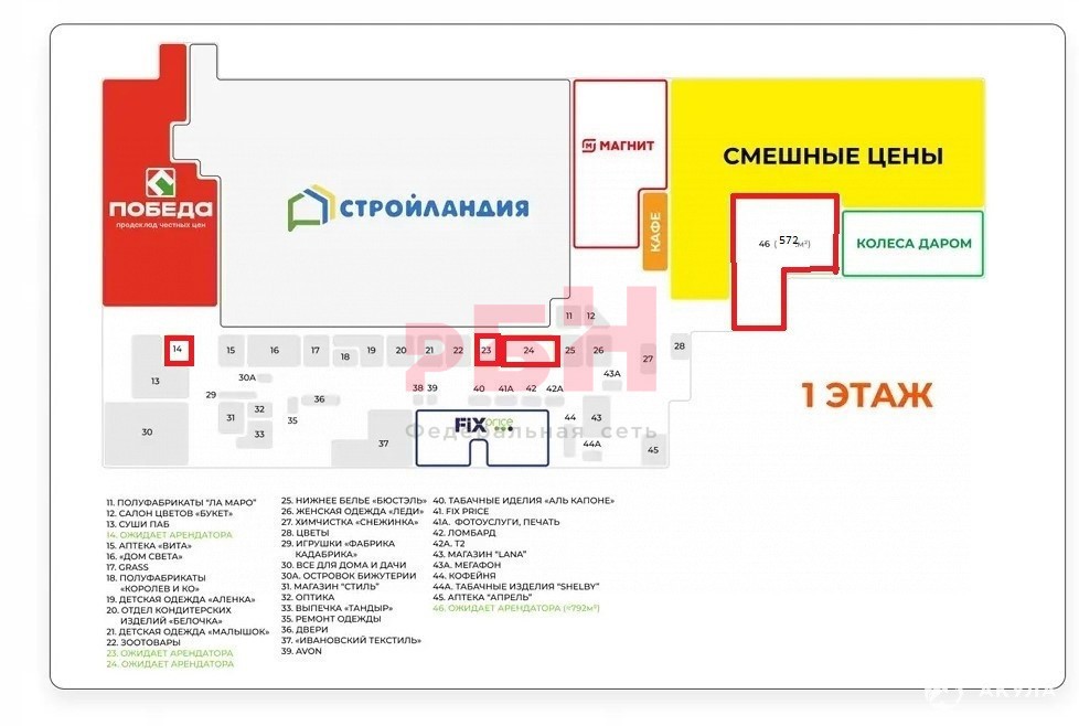 Так же на первом этаже расположены крупные арендаторы: Стройландия, Победа, Фикспрайс.