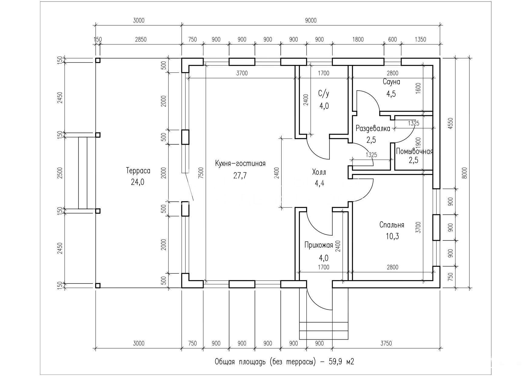 * общая площадь — 59, 9 кв. м;