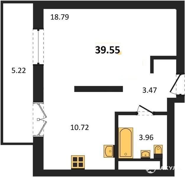 Общая площадь 39, 55 кв.м. , жилая площадь 18, 79 кв.м., кухня 10, 72 кв. м. , лоджия 5, 22 кв.м.