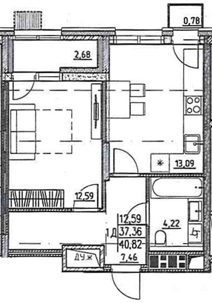 Общая площадь 40, 82 кв.м. Жилая площадь 12, 59 кв.м. Кухня 13, 09 кв.м. Лоджия 2, 68 кв.м. . Место под Гардеробную.