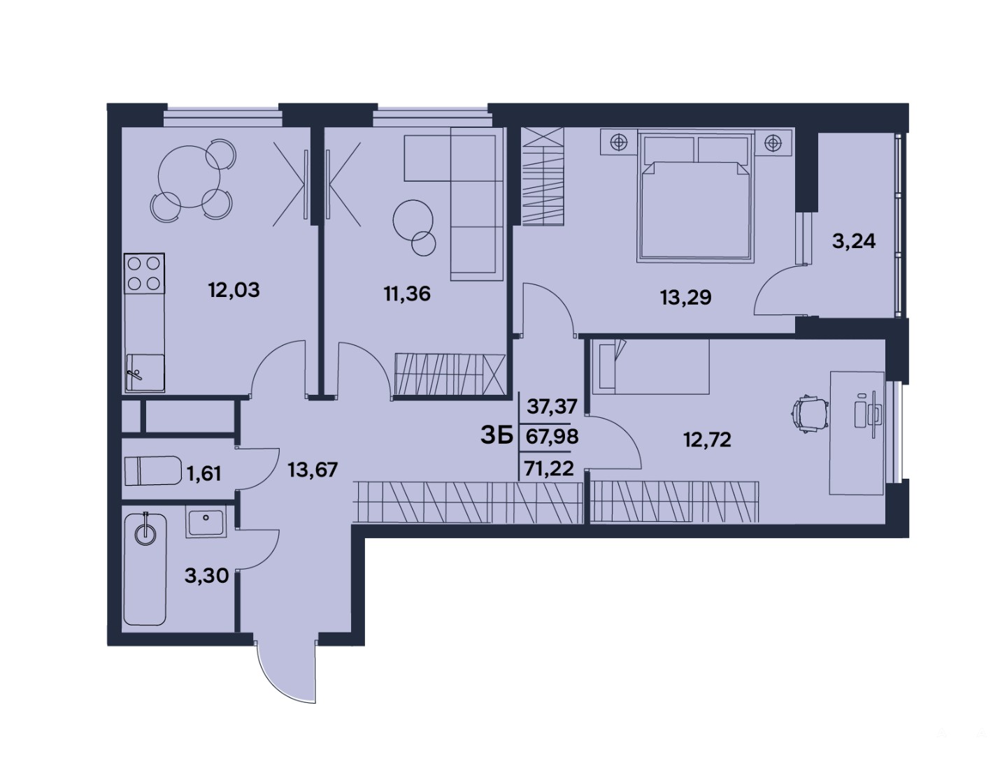 Общая площадь: 71, 22 кв.м. Жилая площадь: 37, 37кв.м. Площадь кухни: 12, 03 кв.м. С/у: раздельный. Лоджия:3, 24 кв.м. Высота потолка 2, 7 м . Имеется выбор этажей и планировок