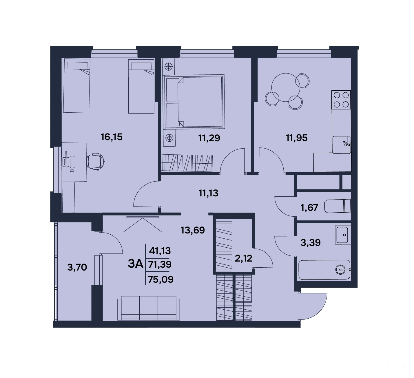 Общая площадь: 75.09 кв.м. Жилая площадь: 41, 13 кв.м. Площадь кухни: 11, 95 кв.м. С/у: раздельный. Лоджия:3, 7 кв.м. Высота потолка 2, 7 м . Имеется выбор этажей и планировок