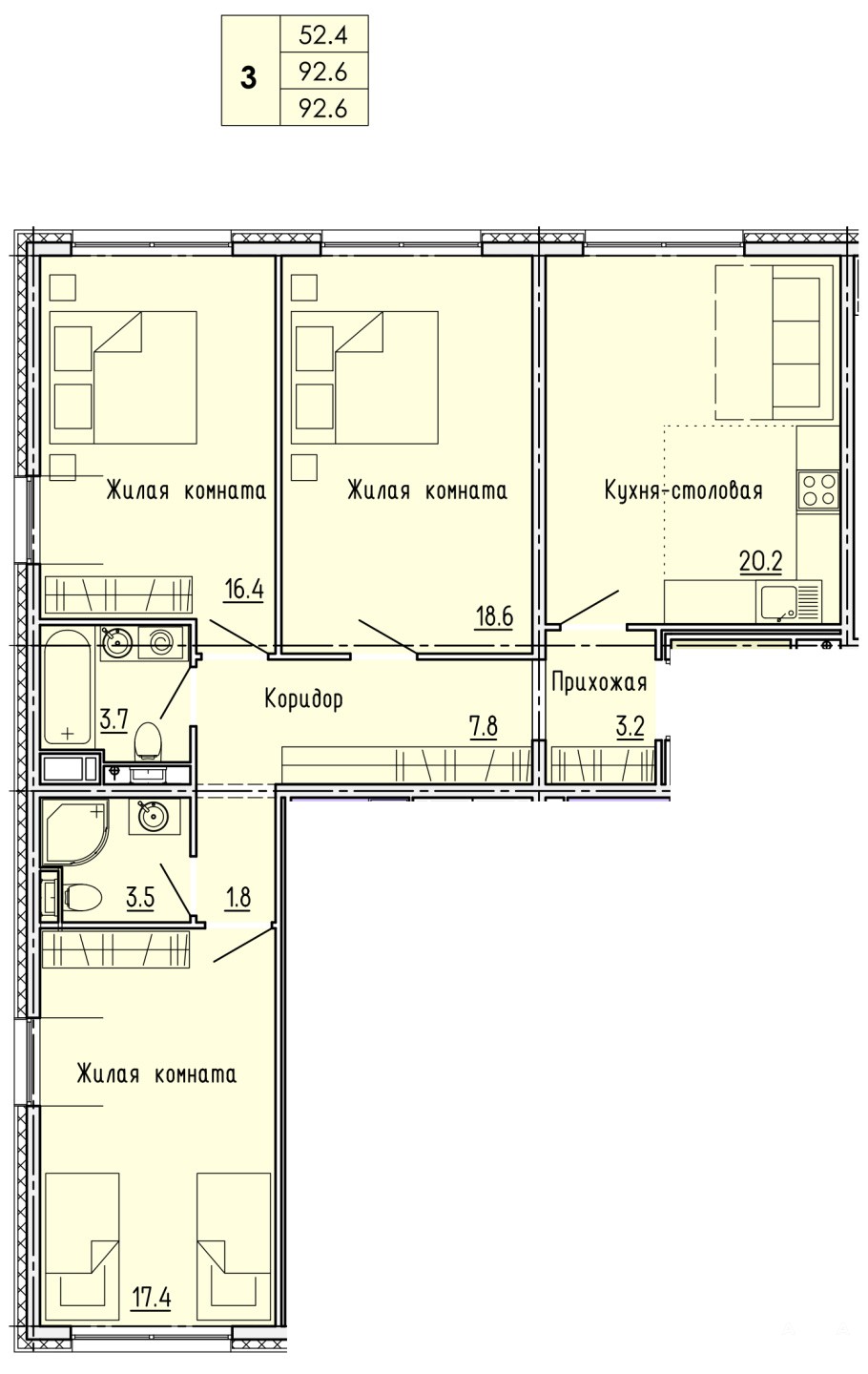Общая площадь 92, 6м2. Жилая площадь 52, 4м2. Кухня 20, 2м2. С/у раздельный