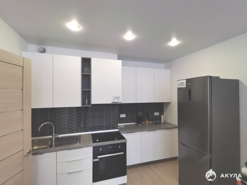Квартира с готовым ремонтом: обои под покраску, ламинат 33 класса, натяжные потолки с точичными светильниками, керамическая плитка в санузле Kerama Marazzi, установлена вся сантехника, межкомнатные качественные двери, кухонный гарнитур с посудомоечной машиной, современный ремонт, светлый или серый оттенок пластика для фасада кухни великолепно сочетается с деревом, фурнитура для кухни элитного класса BLUM, встраиваемая техника, встроенная вытяжка, варочная панель.