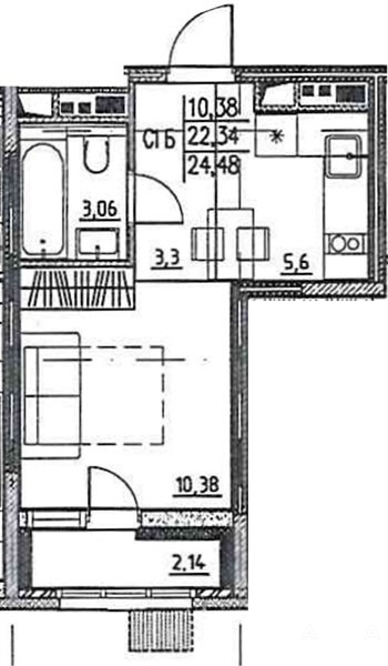 Общая площадь 24, 48 кв.м. Жилая площадь 10, 38 кв.м. Кухня 5, 6 кв.м. Лоджия 2, 14 кв.м.