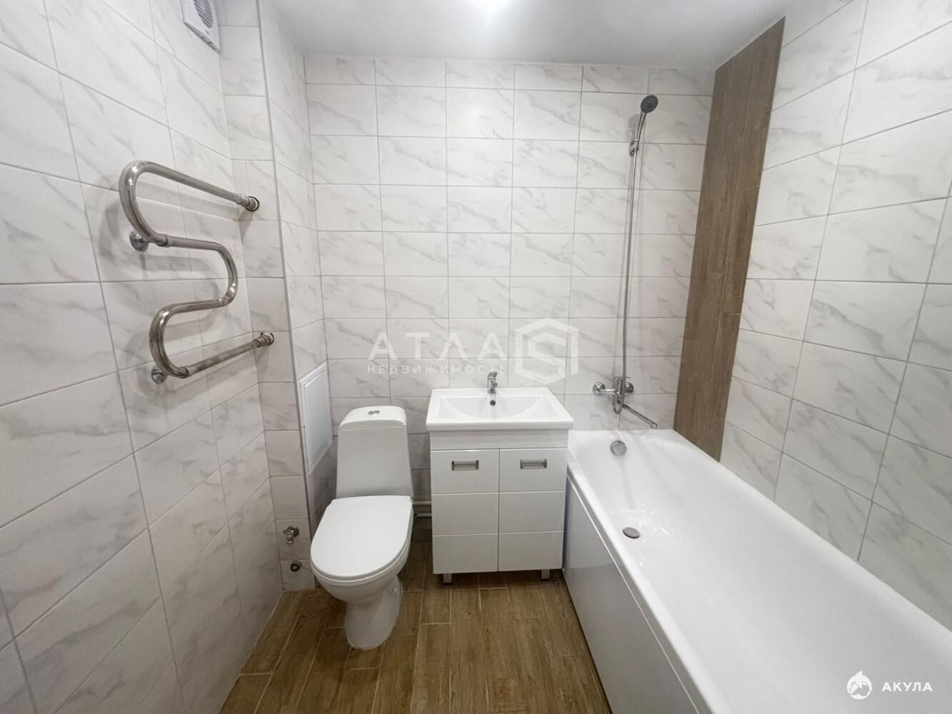 • Санузел: керамическая плитка в стильном дизайне, полностью обустроен (тумба, раковина, акриловая ванна с литым экраном, душевой комплект, смеситель, унитаз, полотенцесушитель).