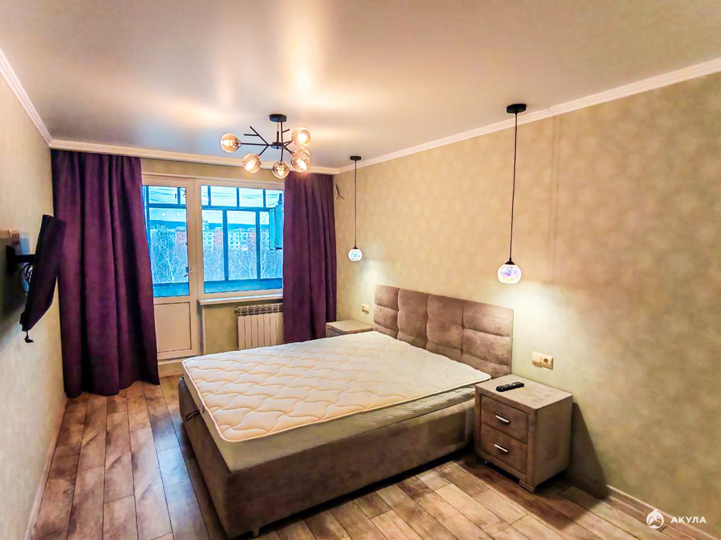 Меблированы кухня и спальня. На кухне – гарнитур, обеденный стол. В комнате – двуспальная кровать с прикроватными тумбами. Выход на лоджию из спальни.